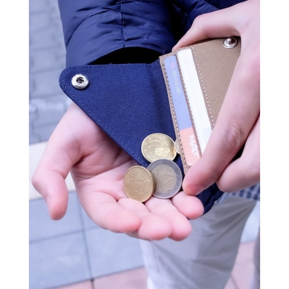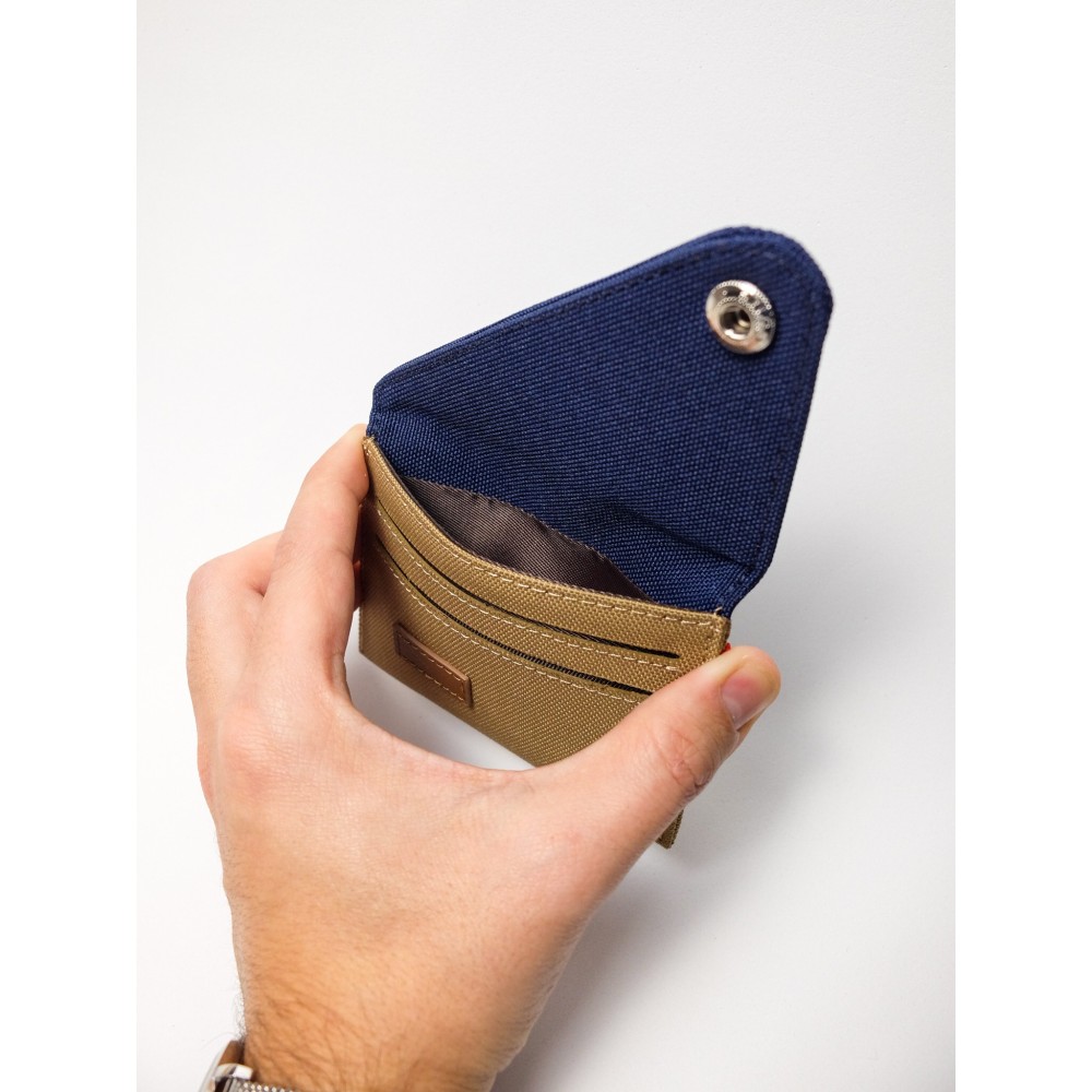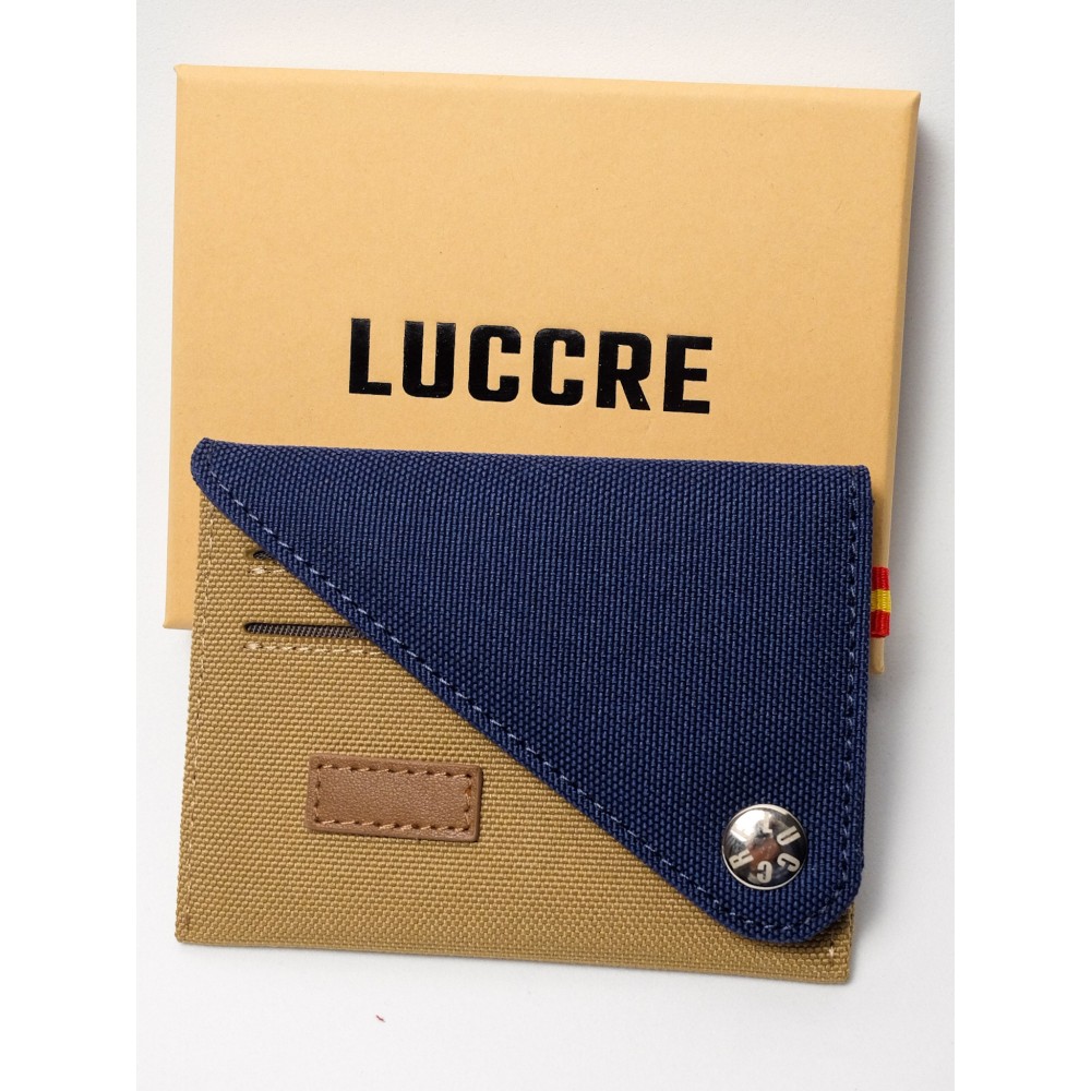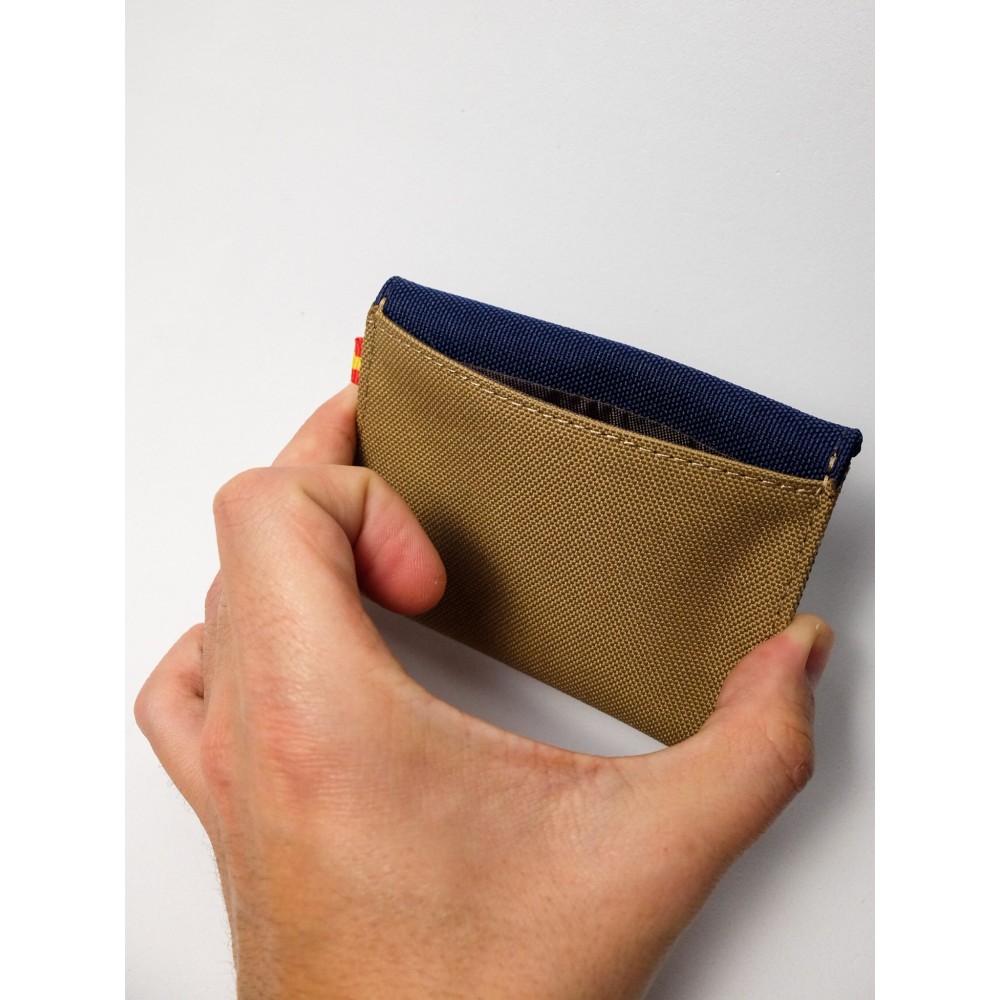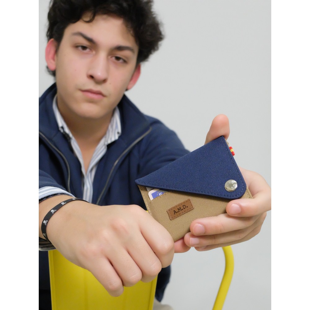 Monedero-tarjetero en azul marino y camel. Detalle bandera de España.